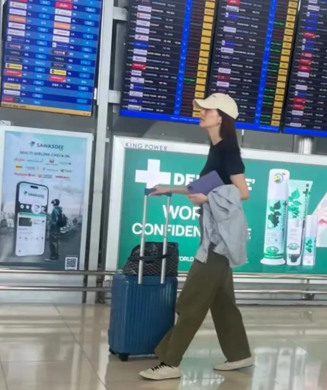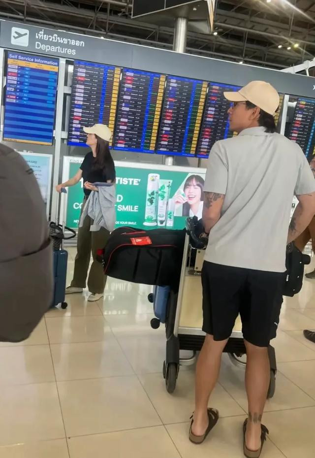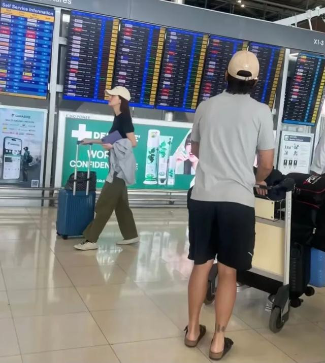 吴千语穿着藏蓝色的T恤,她手里推着行李箱,她整个人很单薄。施伯雄推着一车行李,这趟泰国之行,他们带了很多东西。两人戴着情侣棒球帽,他俩走到哪里都很甜蜜。