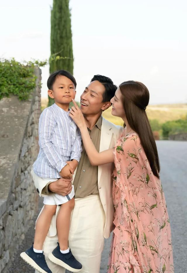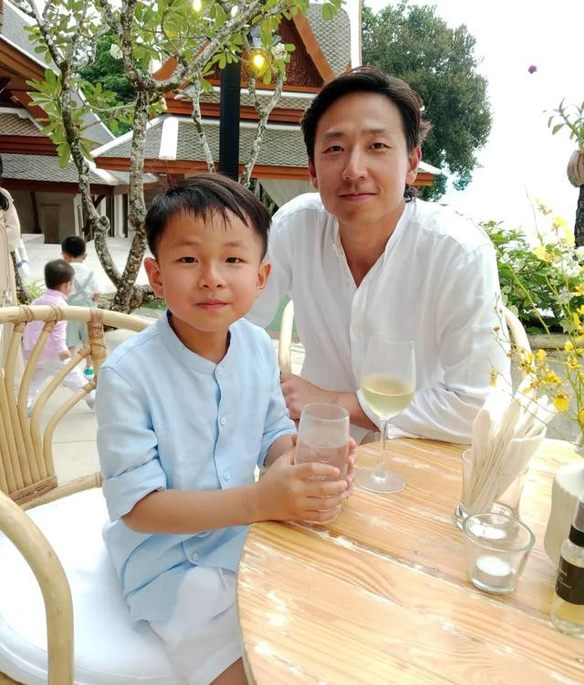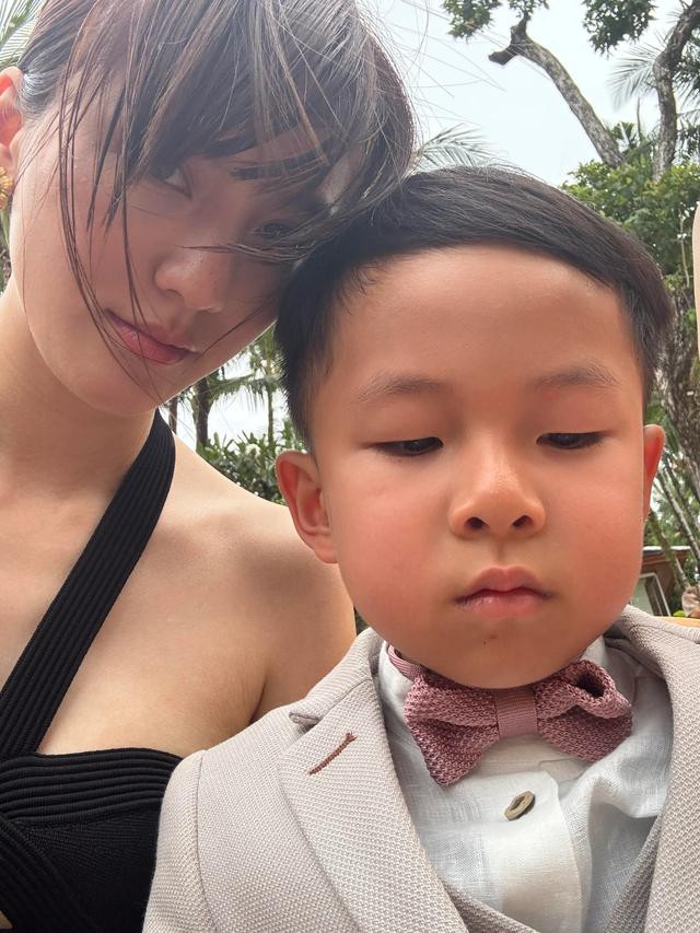 施伯雄的小侄子jojo也来了,他的眼睛很像施伯雄。吴千语很喜欢这个小侄子,她还和jojo一起合影了。jojo是婚礼的花童吧,他穿着小西服很帅气。吴千语戴着金色的花朵图案的耳饰,金色配黑色很经典。