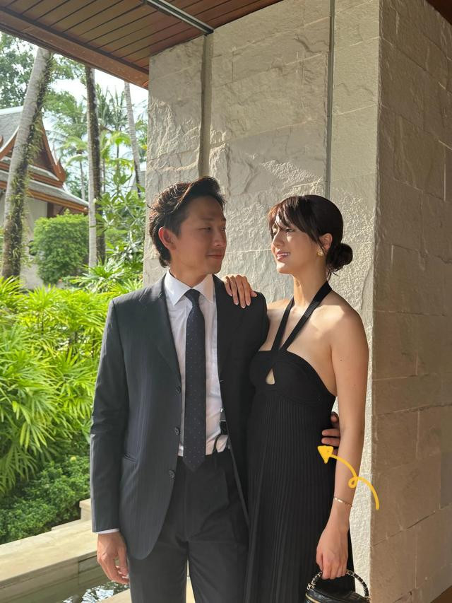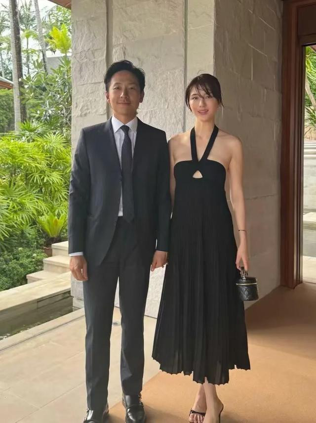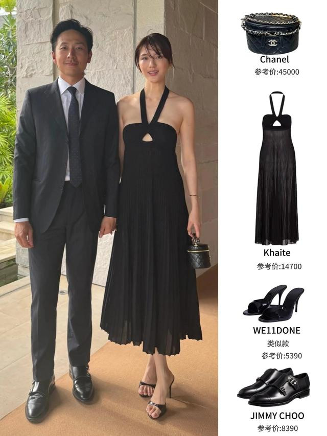 吴千语和施伯雄参加婚礼的穿搭很得体大方。施伯雄穿了一套灰色西装,他搭配了一身Jimmy Choo的黑色皮鞋,他的穿搭很显贵气。吴千语手拎着香奈儿包包,她穿了一条挂脖的小黑裙搭配细跟高跟鞋,这身穿搭参加婚礼很合适。吴千语的肩颈很美,她就像一只黑天鹅般从容优雅。